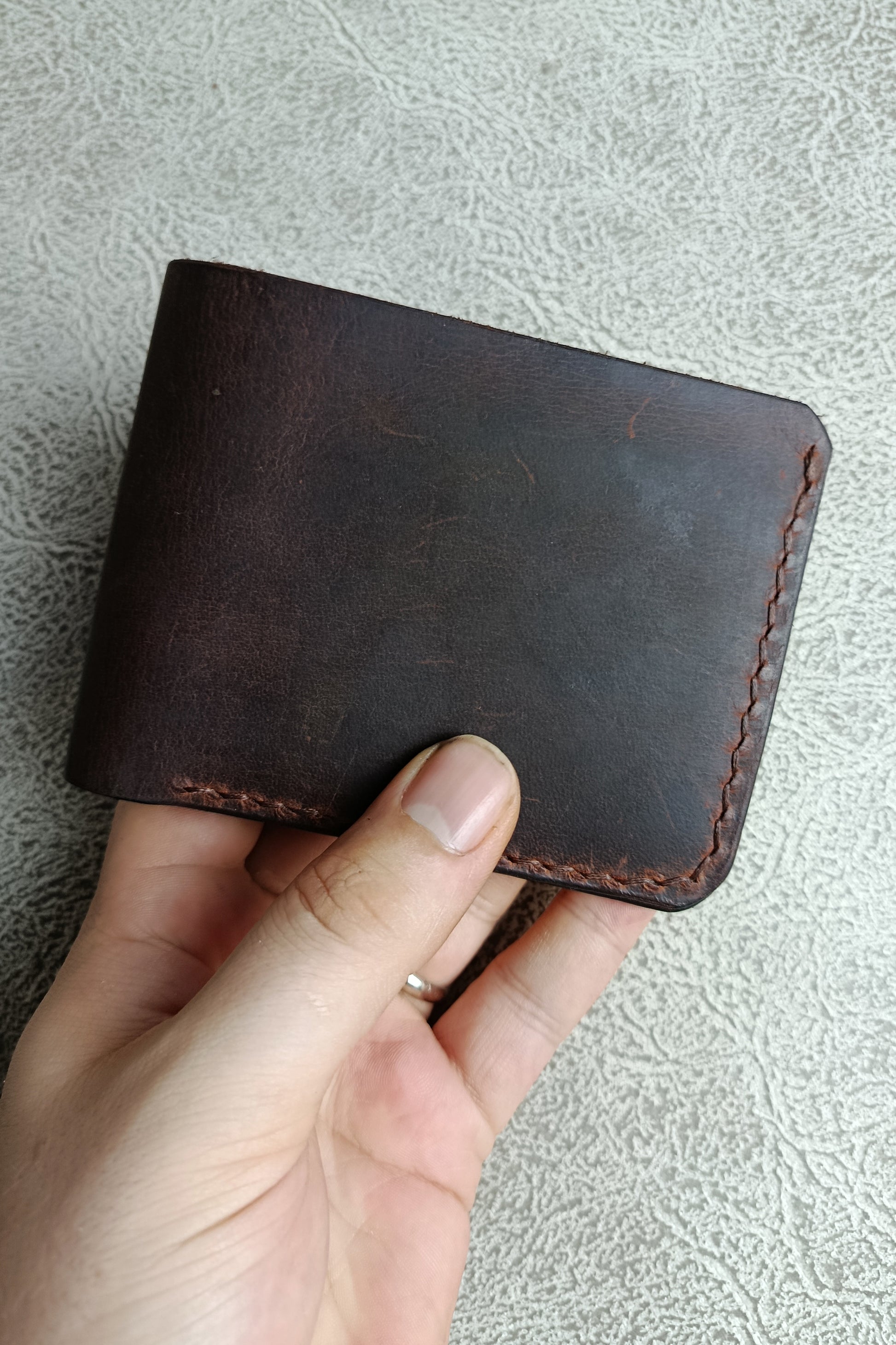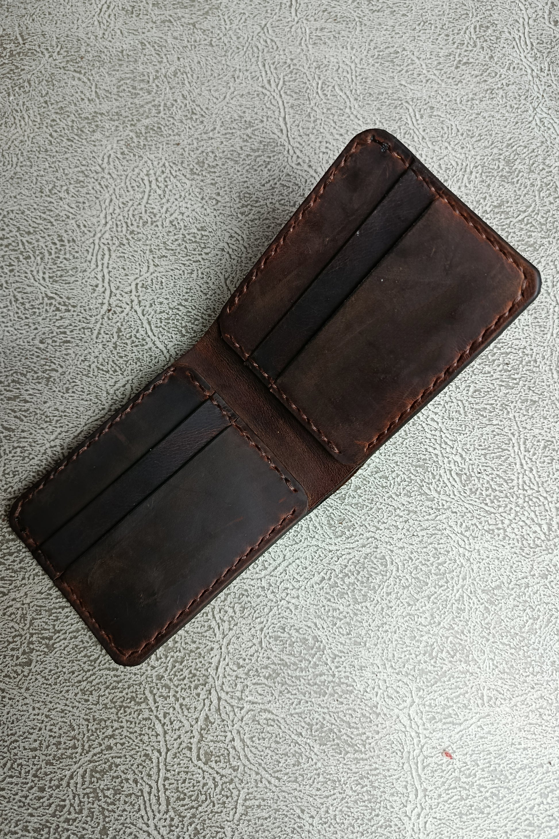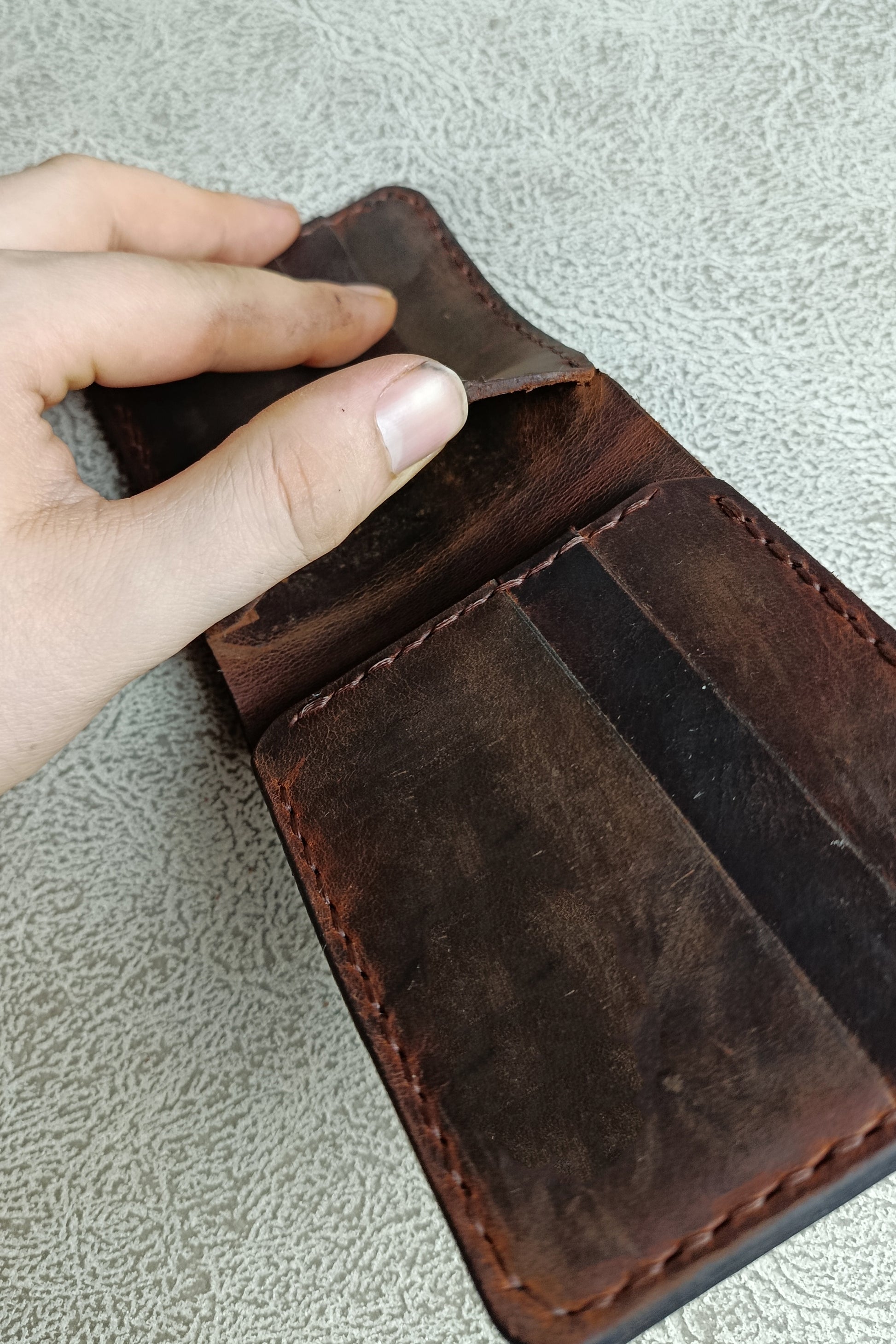 Bu el yapımı hakiki crazy horse deri cüzdan, her kullanımda eşsiz bir patina kazanır ve sahibine özel bir karakter oluşturur. Zanaatkârlık, mumlu iplikle yapılan sağlam el dikişinde ve özenle bitirilen kenarlarda gizlidir. Kompakt yapısı sayesinde cebinizde yer kaplamaz; günlük kullanımda maksimum konfor sağlar.
