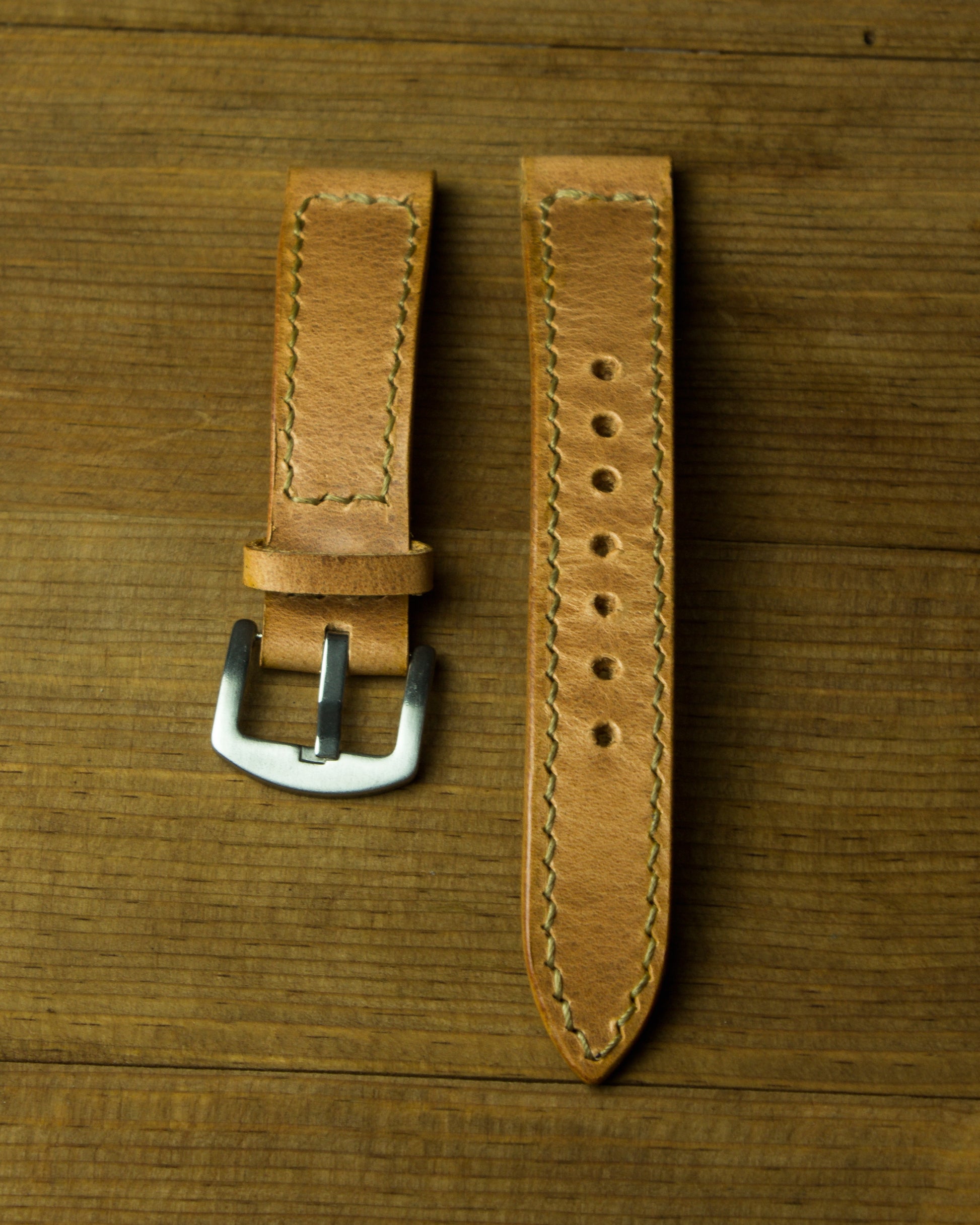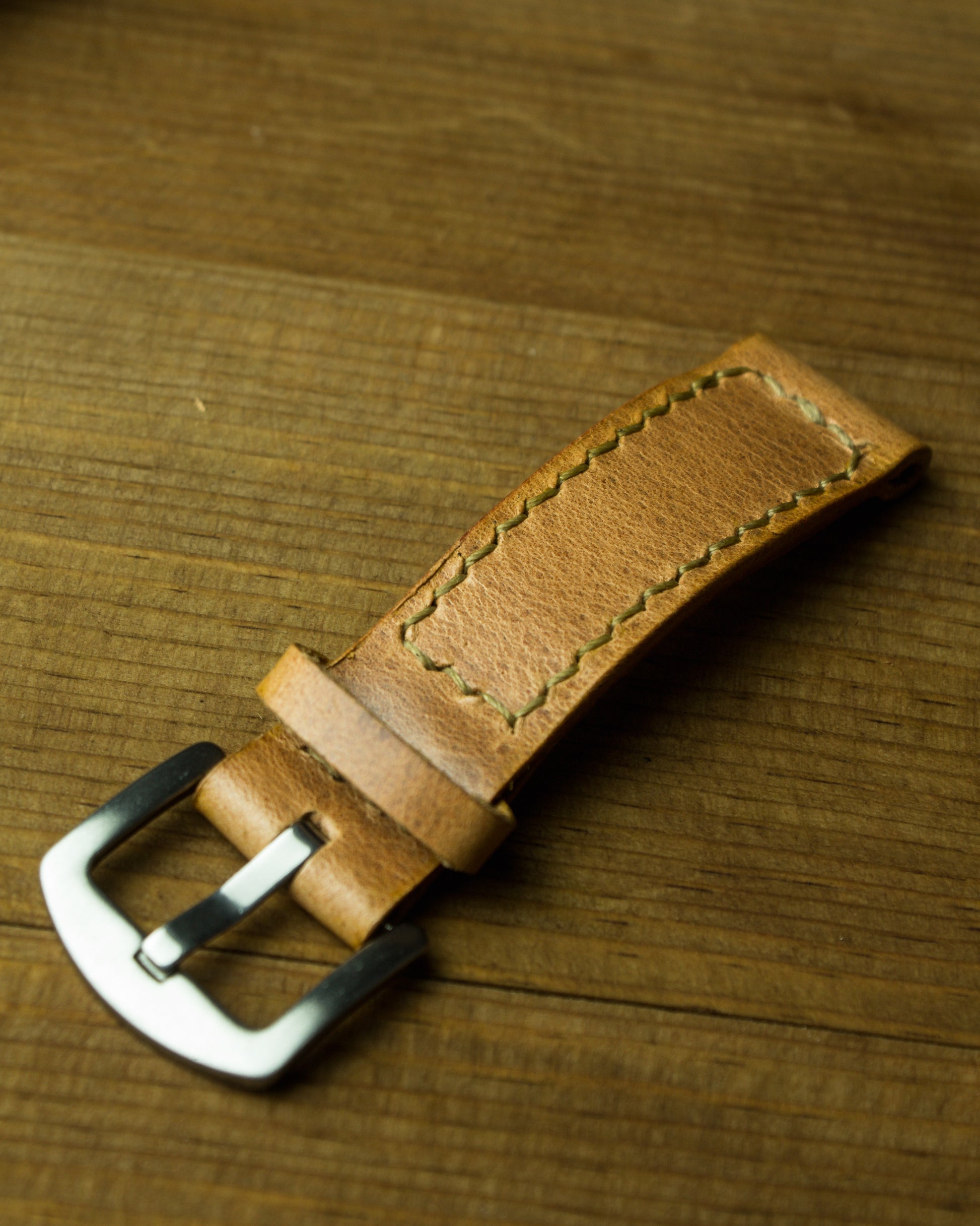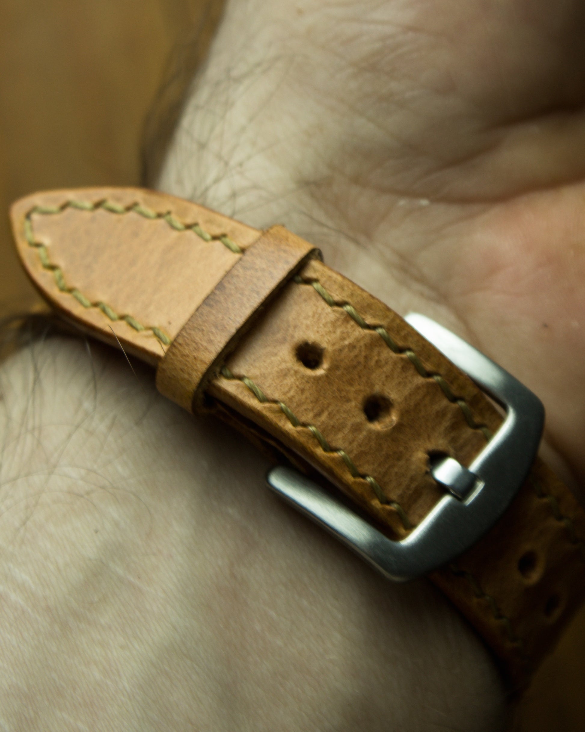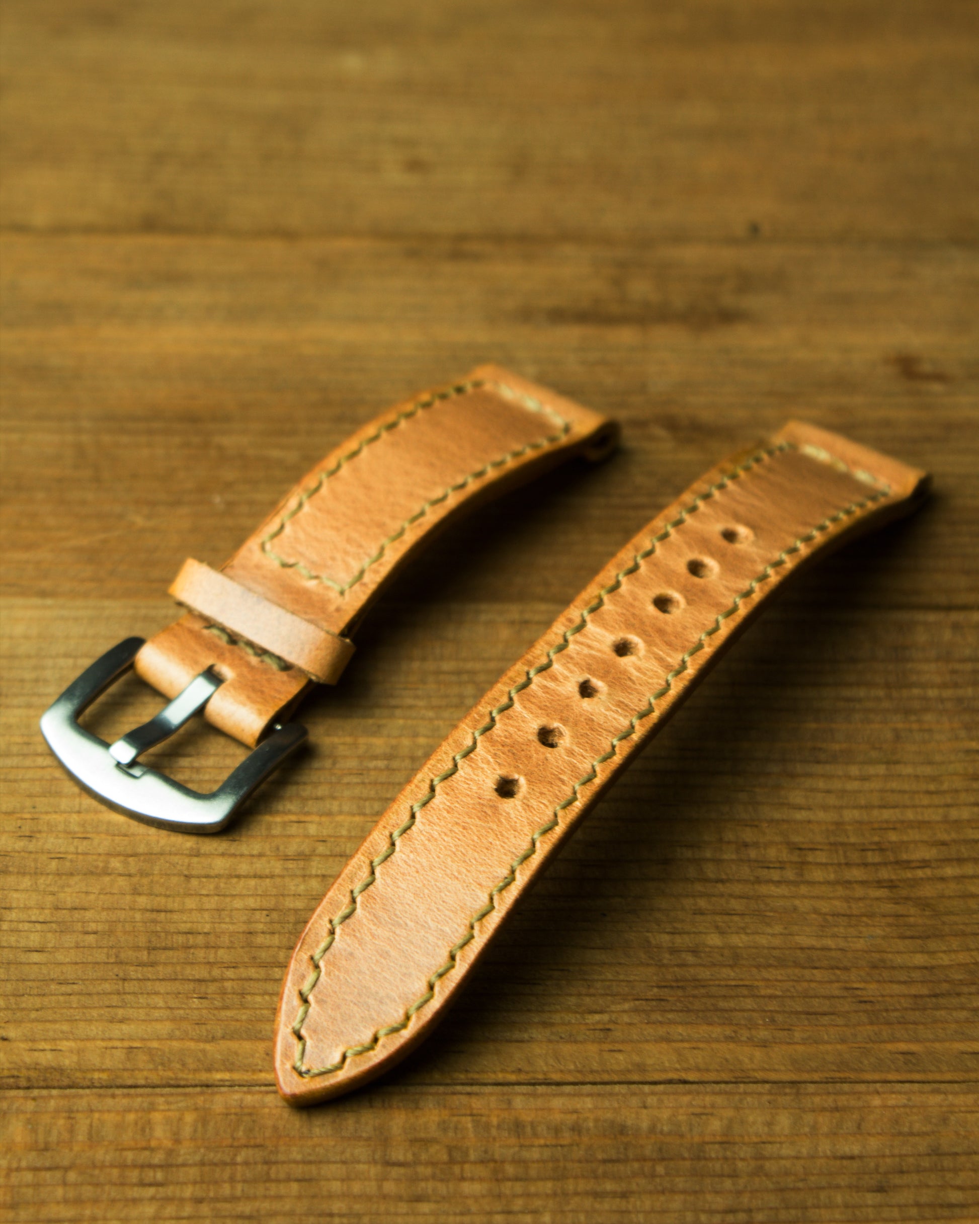 Kayış, 3.85 mm Fransız stil zımba ile delinmiş, dikişleri ise 0,55 mm yuvarlak mumlu ip kullanılarak elde dikilmiştir. Bu üretim yöntemi, dikiş hatlarının düzgün, sağlam ve uzun ömürlü olmasını sağlar.